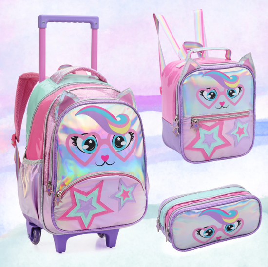 - Kit Mochila com Rodas + Lancheira + Estojo Gatinha Estrela